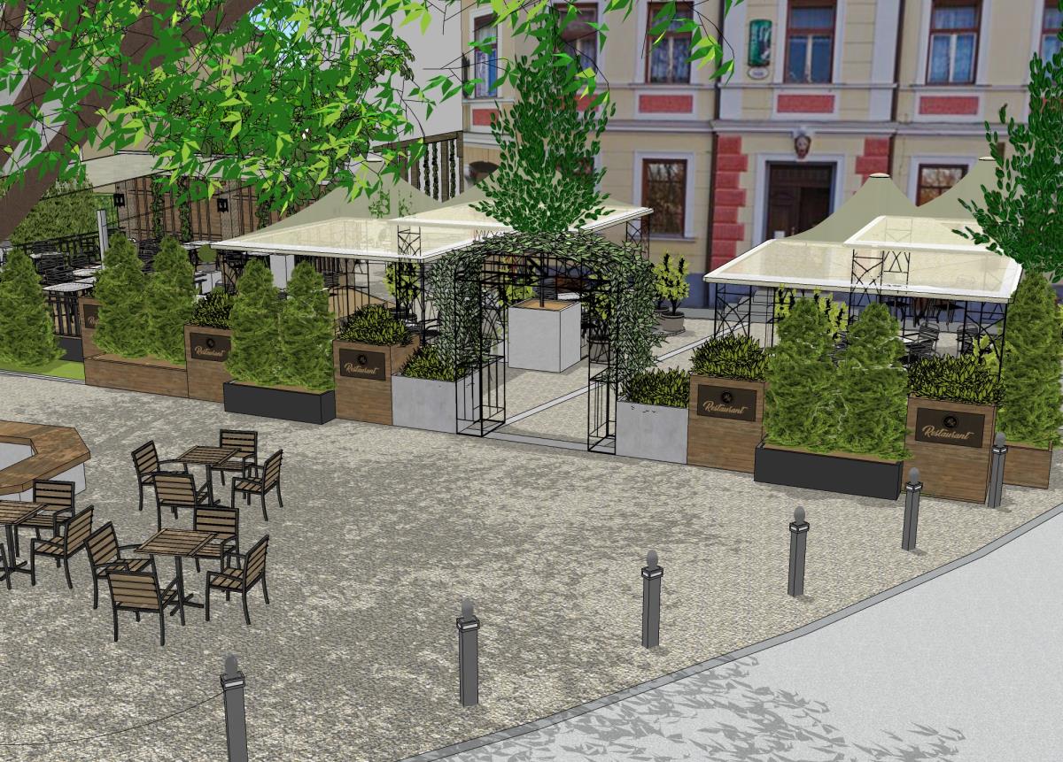 Del idejne zasnove je tudi ureditev pred Karlovškovo hišo, ki z novim lastnikom pridobiva usklajeno in s trgom povezano vlogo. Za potrebe restavracije v objektu in resnično doživeto doživljanje trške ureditve in celotnega prostora, je na prostoru pred Karlovškovo hišo predvidena terasa restavracije. Lesena terasa je v dveh nivojih, visoka stena proti sosednji hiši na zahodni strani trga je kombinacija stebrov iz gabionov in lesa, na njej bo brajda. Streha bi bila pomično platno, za zmanjšanje hrupa s ceste in trga so predvidene zimzelene grmovnice v koritih in vodni motivi, ki šumijo. Pred Karlovškovo hišo je predviden širok prehod do vhoda v objekt, ki bo v sozvočju z edinstveno arhitekturo njegovega pročelja in ga še posebej poudaril. Ob robu terase so lesena, betonska in antracit korita v katerih so predvidene drevesne in grmovne zasaditve, ki se dopolnjujejo in prehajajo v leseni del, ki se povezuje z osnovno ureditvijo fontane.